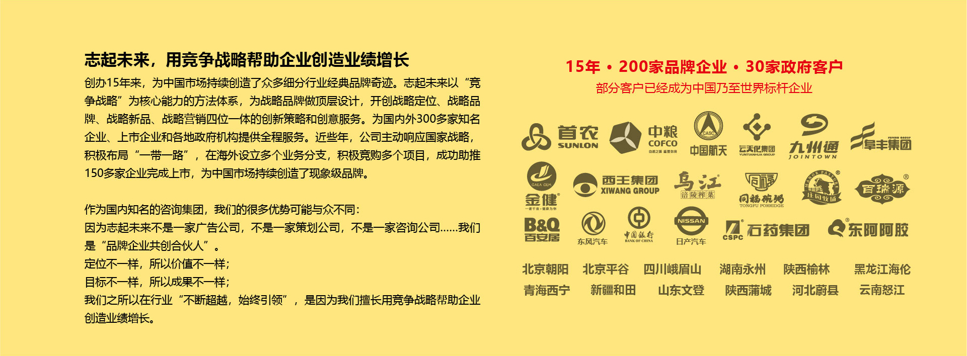 志起未来帮助客户全面提升战略竞争力,并最终体现在客户行业地位提升、可持续发展能力提升和经济效益提升等诸多方面,志起未来部分客户已经成为中国乃至世界标杆企业。